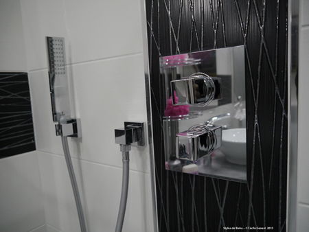 carrelage SOL existant, pose faïence murale noir et blanche + listel chrome en décor