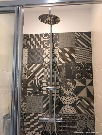 sol et remontée douche en carrelage imitation carreaux de ciment 20x20 + murs en faïence greige mat 25x75
