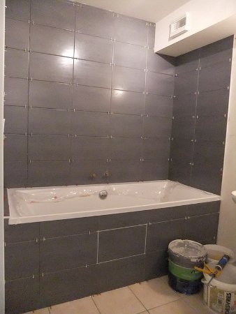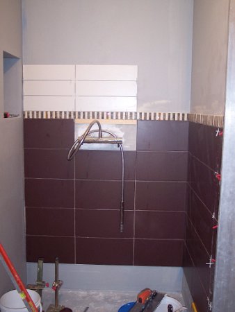 Pendant les travaux, pose d'un format 33x33 et habillage d'un coffre pour les évacuations d'eau