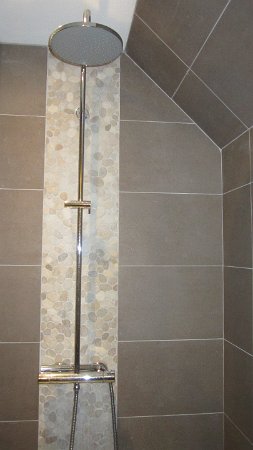 carrelage imitation parquet + douche à l'italienne en galets multicolores